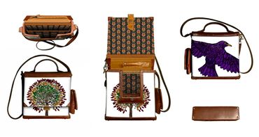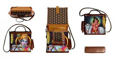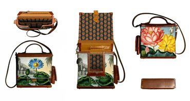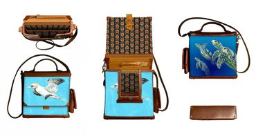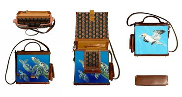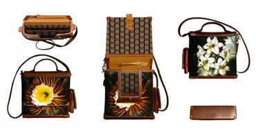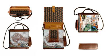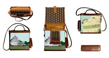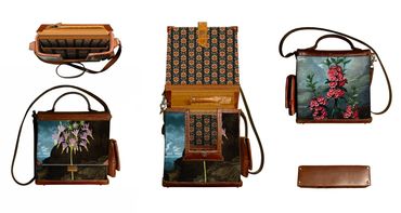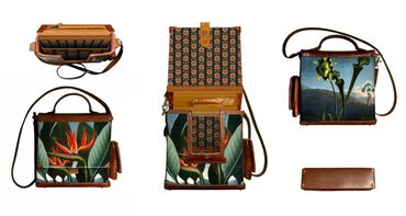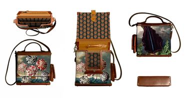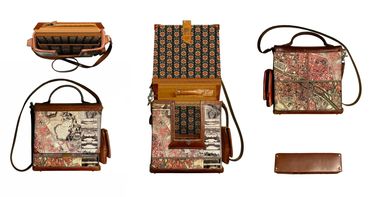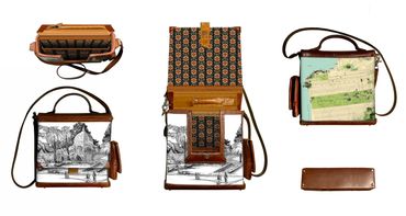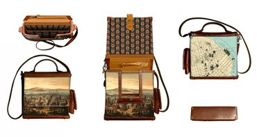 These Large Handbags feature my signature fleur de lis lining with either my original artwork, antique maps, or antique imagery for front and back. Each design is offered as limited edition bags (only 100 will ever be made of each). Dimensions are: 11 1/2" x 11 1/2" x 3". Bags are hand crafted from giclée art canvas, hand sewn to high quality leather. Several component options are available including; mobile device holder (shown below), pen & pencil holder (shown below), wallet pocket, dog waste bag roll holder, pocket knife sheath, key ring, side loop for holding a retractable leash, etc. Price is impacted by the options selected-> see details here.